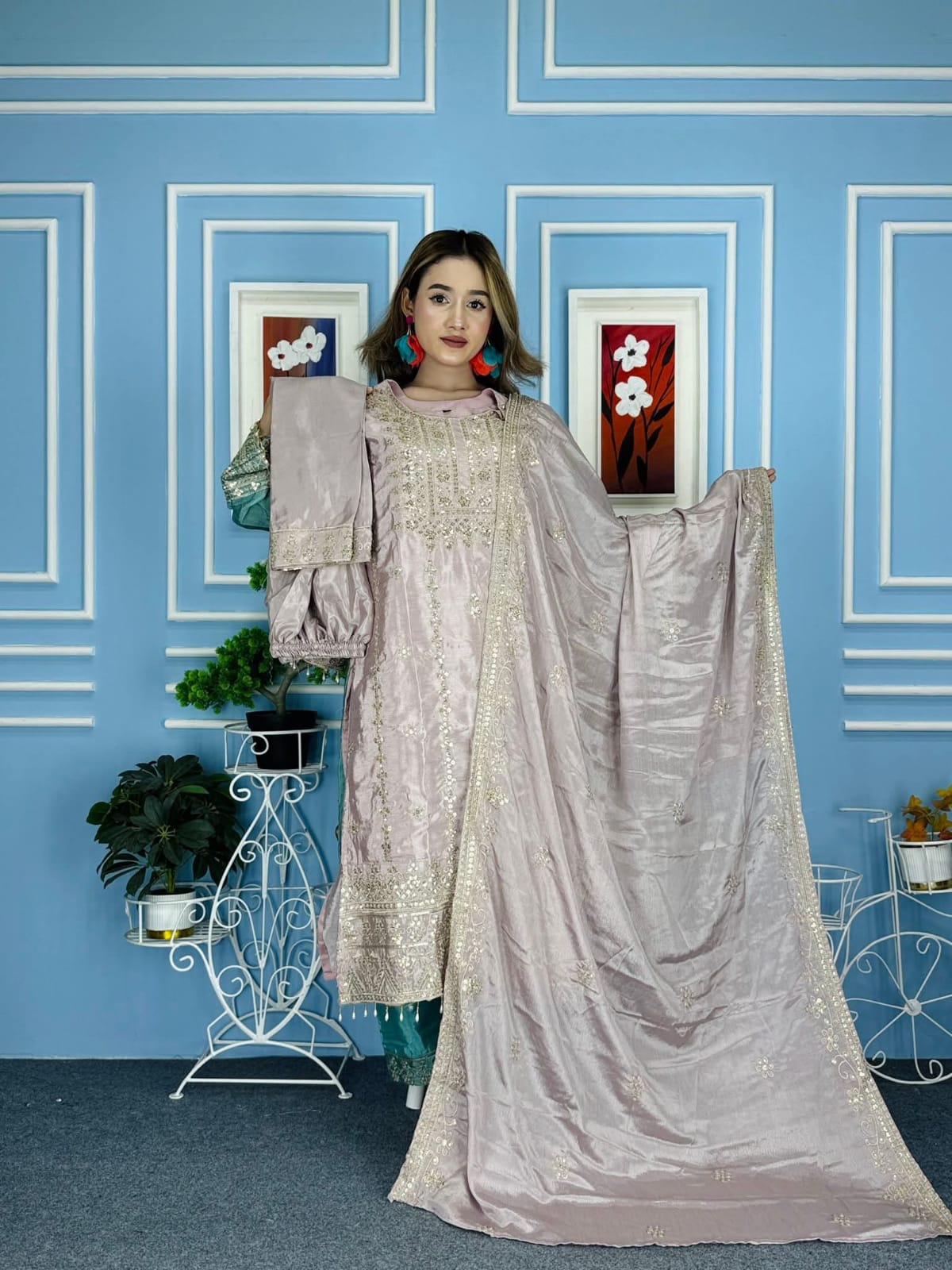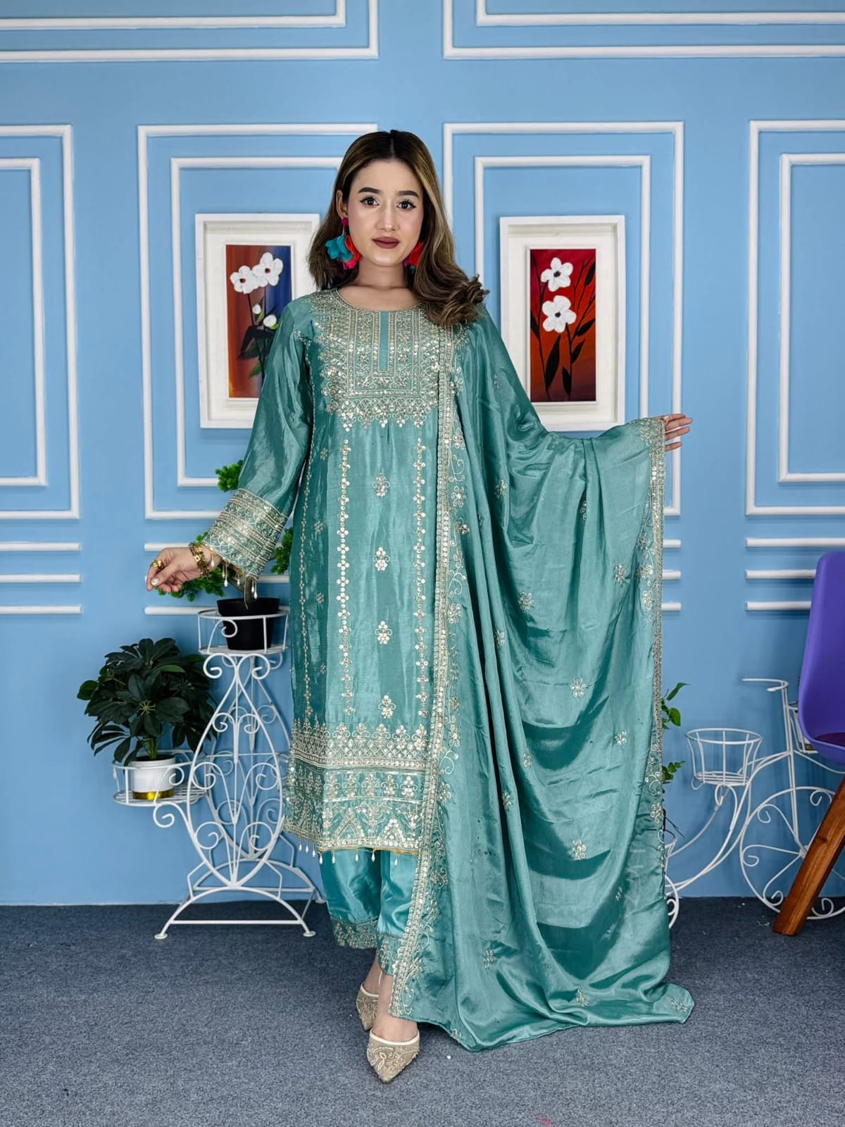 চিনোন সফট জর্জেট কাপড়ের উপরে জরি সুতা + সিকোয়েন্স এর কাজ করা সাথে ইনার অ্যাটাচ করা থাকবে। বডি সাইজ৩৬/ ৩৮/৪০/৪২/৪৪/৪৬ জামার লং ৪২/৪৩ সেলোয়ার লং-৩৭/৩৮