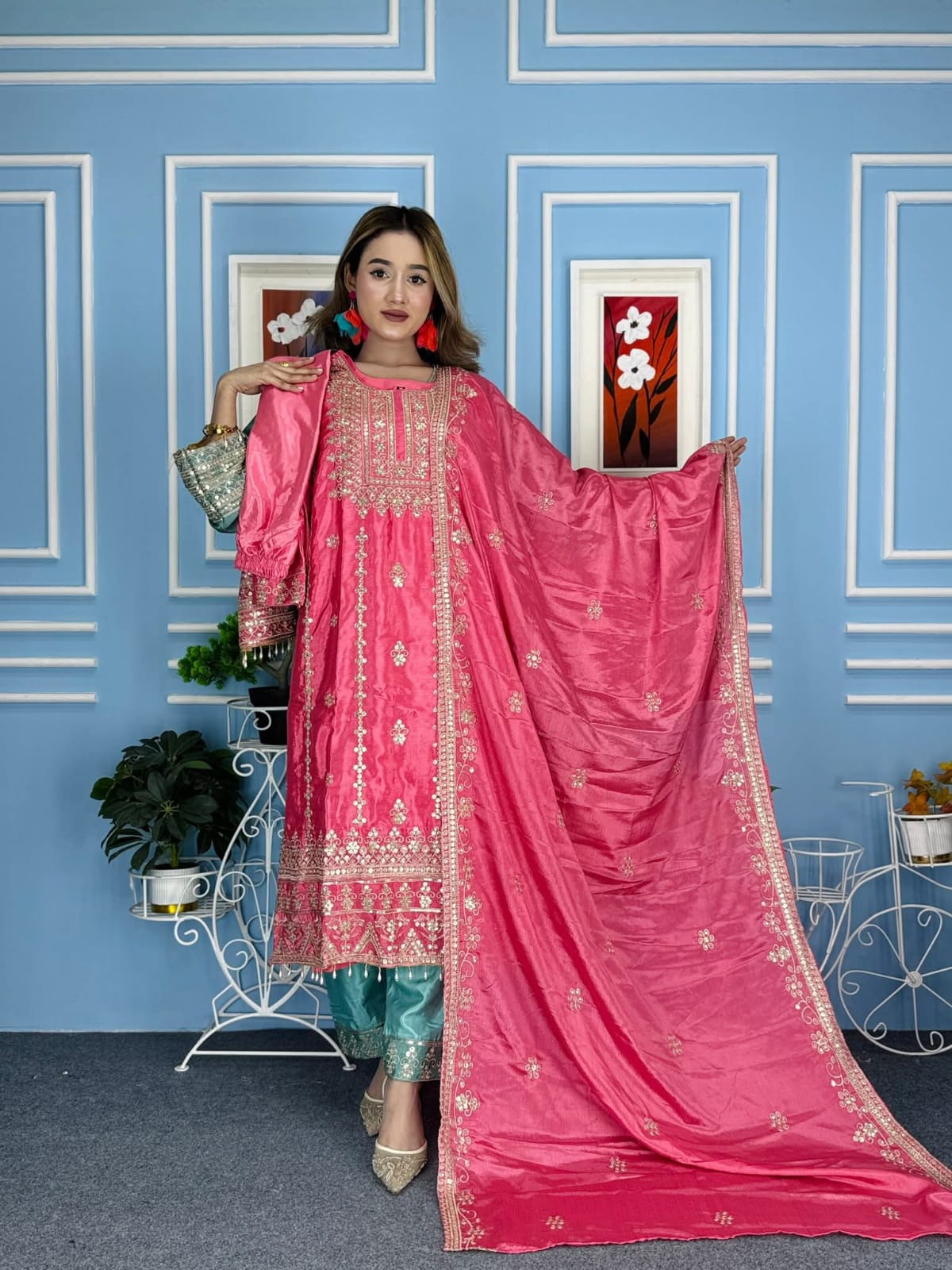চিনোন সফট জর্জেট কাপড়ের উপরে জরি সুতা + সিকোয়েন্স এর কাজ করা সাথে ইনার অ্যাটাচ করা থাকবে। বডি সাইজ৩৬/ ৩৮/৪০/৪২/৪৪/৪৬ জামার লং ৪২/৪৩ সেলোয়ার লং-৩৭/৩৮